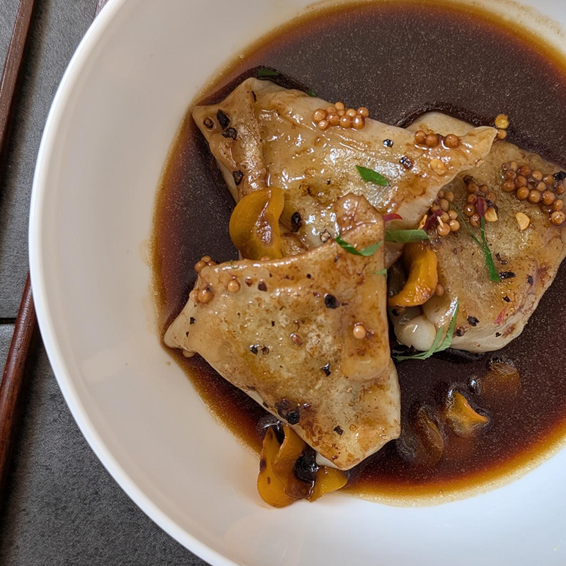 Möhrensuppe mit glasierten Tempeh-Spießen